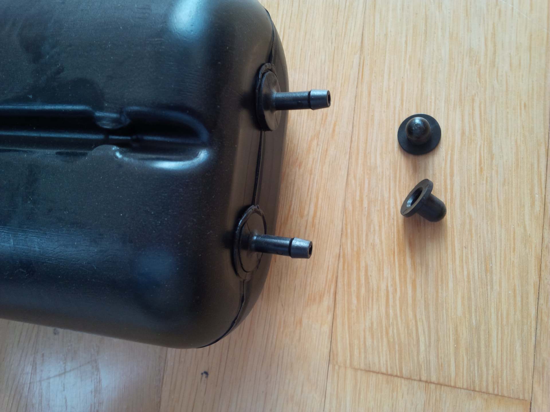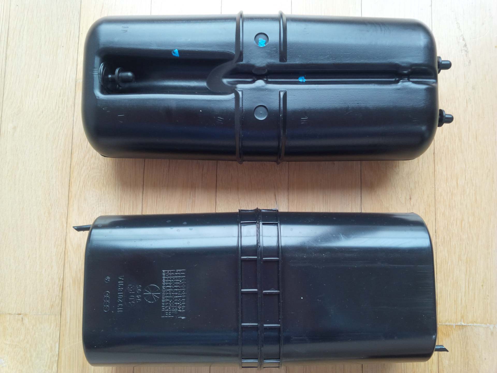 Der neue Behälter hat drei Anschlüsse, so dass das grüne T-Stück und 2 Klemmschellen weggelassen werden können. Ferner ist der vordere Anschluß jetzt innen, so dass es kein Abbbrechen des Stutzens durch umherwirbelndes Gepäck mehr geben wird.