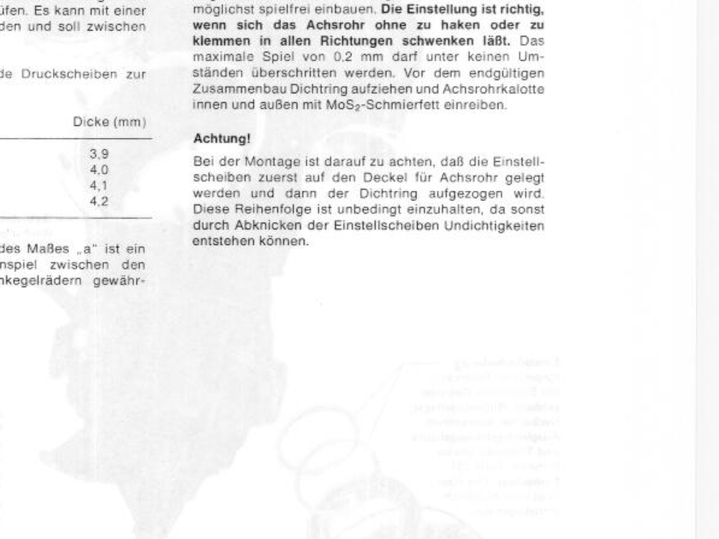 Wenn ich mich recht erinnere, habe ich die Einstellscheiben getriebeseitig auf die Stehbolzen geschoben und den O-Ring mit Fett ebenfalls getriebeseitig aufgelegt, dann Welle und Rohr mit allem rein und zum Schluss den Deckel drauf. War ne blöde Pfriemelei und ist inzwischen auch schon seeeeehr lange her.