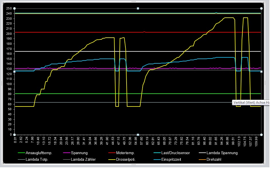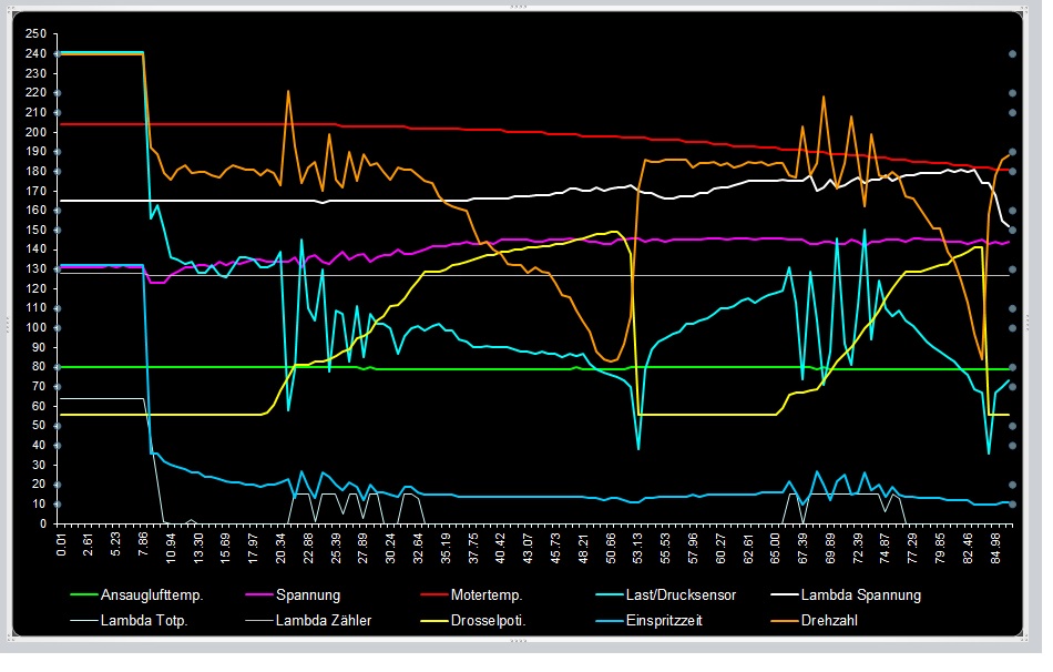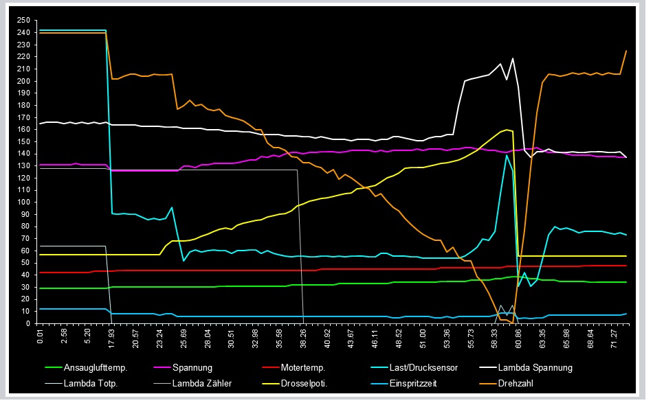 Dann kannst du sehen, ob der Drosselklappenpoti fehlerfrei anzeigt, und den Motor die Werte für höhere Drehzahlen übermittelt.