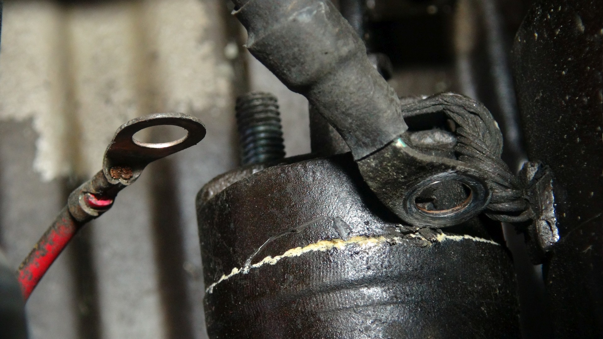 Dann krabbelte ich unter den Wagen und sah mir die Kabelverbindung am Anlasser an. Die Mutter war nicht viel mehr als handfest, ich machte mir schon Hoffnungen. Ansonsten war alles sauber und rostfrei. Das Kabel vom +-Pol der Batterie hat laut Aufdruck wohl 25 mm2. Die Stromlaufpläne stimmen demnach nicht.