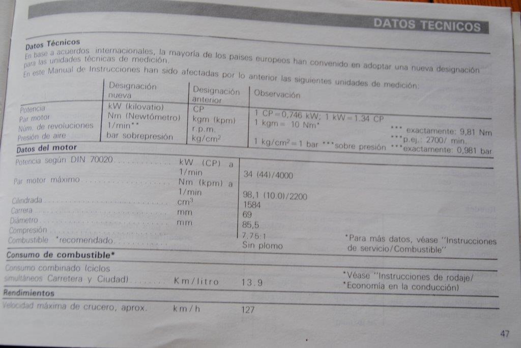 In meinen Papieren steht 34 kW das sind 46 PS. In der original mexikanische Bedienungsanletung steht wie im Prospekt 44 CP aber auch 34 kw: