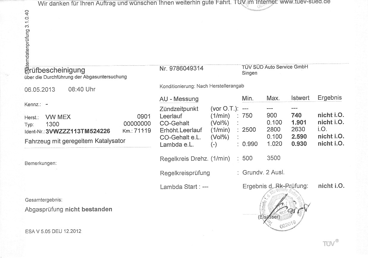 Mein Hauptproblem ist aber die AU, siehe Anhang. Mein Käfer ist Bj. 96 hat 71Tkm, liegt das am Kat oder wo seht ihr das Problem? Motor war nicht sonderlich warm. Löcher hat der Auspuff keine (sichtbaren), Sonde wurde einfach reingesteckt.